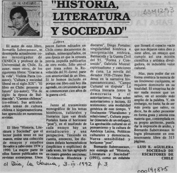"Historia, literatura y sociedad" [artículo] Luis E. Aguilera.