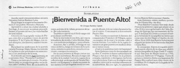 Bienvenida a Puente Alto! [artículo] Enrique Ramírez Capello.