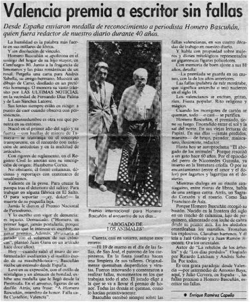 Valencia premia a escritor sin fallas [artículo] Enrique Ramírez Capello.