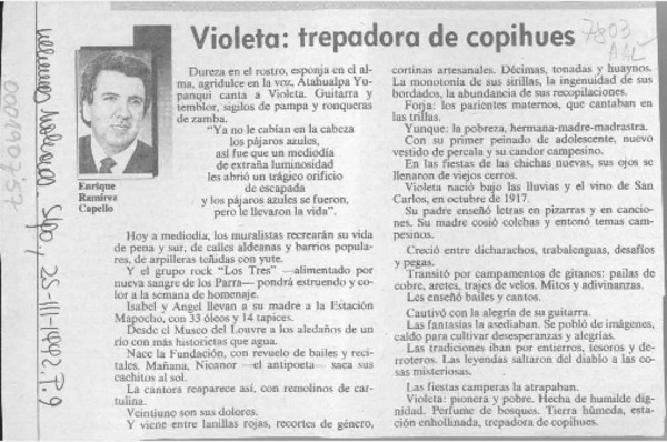 Violeta, trepadora de copihues [artículo] Enrique Ramírez Capello.