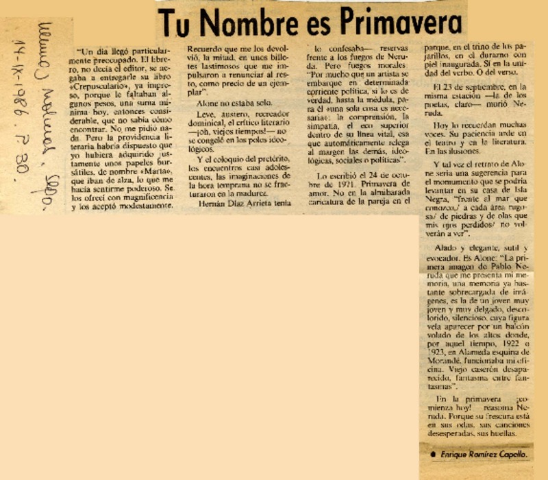 Tu nombre es primavera [artículo] Enrique Ramírez Capello.