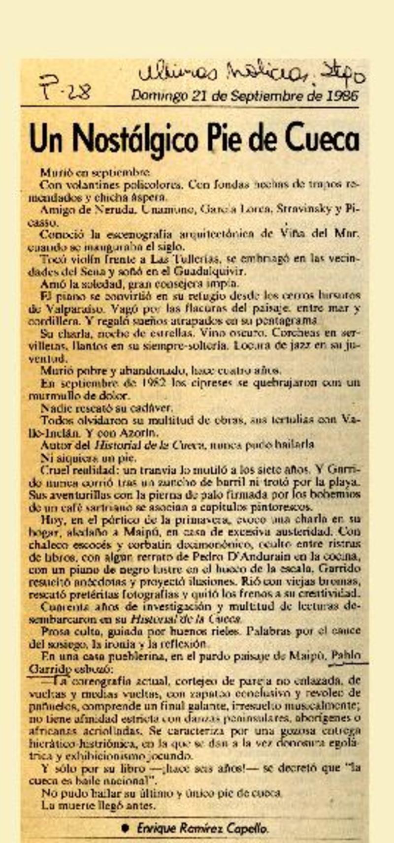 Un nostálgico pie de cueca [artículo] Enrique Ramírez Capello.
