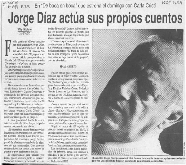 Jorge Díaz actúa sus propios cuentos [artículo] Willy Nikiforos.