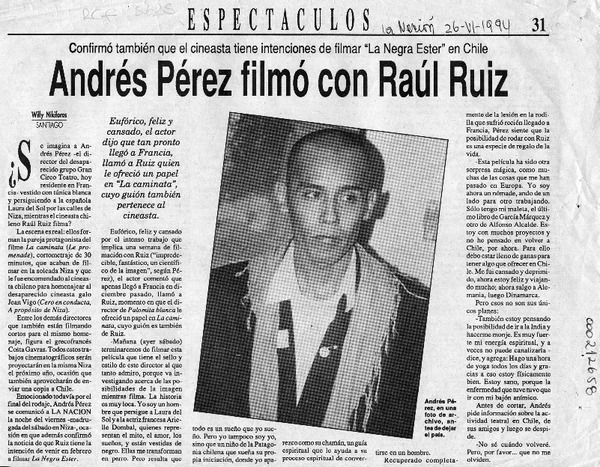 Andrés Pérez filmó con Ral Ruiz [artículo] Willy Nikiforos.
