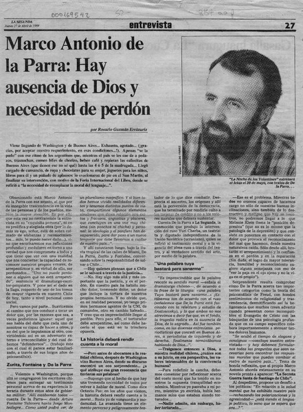 Marco Antonio de la Parra, "Hay ausencia de Dios y necesidad de perdón" [artículo] Rosario Guzmán Errázuriz.