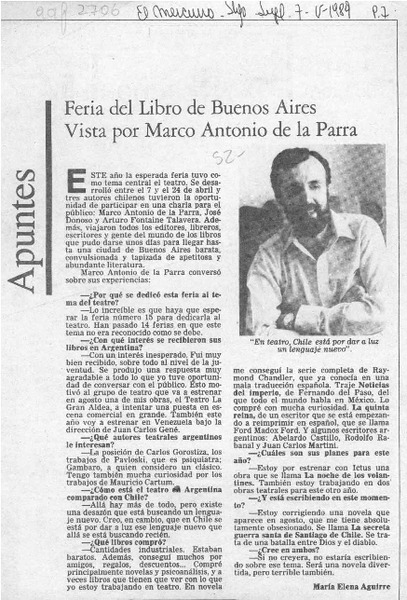 Feria del Libro de Buenos Aires vista por Marco Antonio de la Parra [entrevista] [artículo] : María Elena Aguirre.