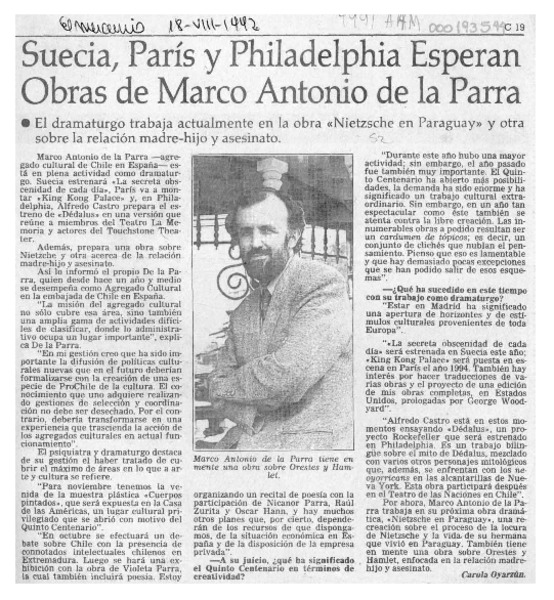Suecia, París y Philadelphia esperan obras de Marco Antonio de la Parra [artículo] Carola Oyarzún L.
