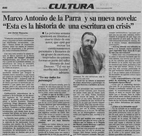 De la Parra: "Ríos cayó en una espiral de conductas autodestructivas" [entervistas] [artículo] : Christian Salgado A.