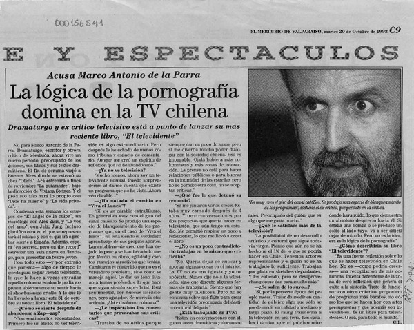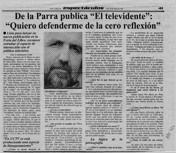 De la Parra publica "El televidente", "Quiero defenderme de la cero reflexión" [entrevista] [artículo] : Constanza León.