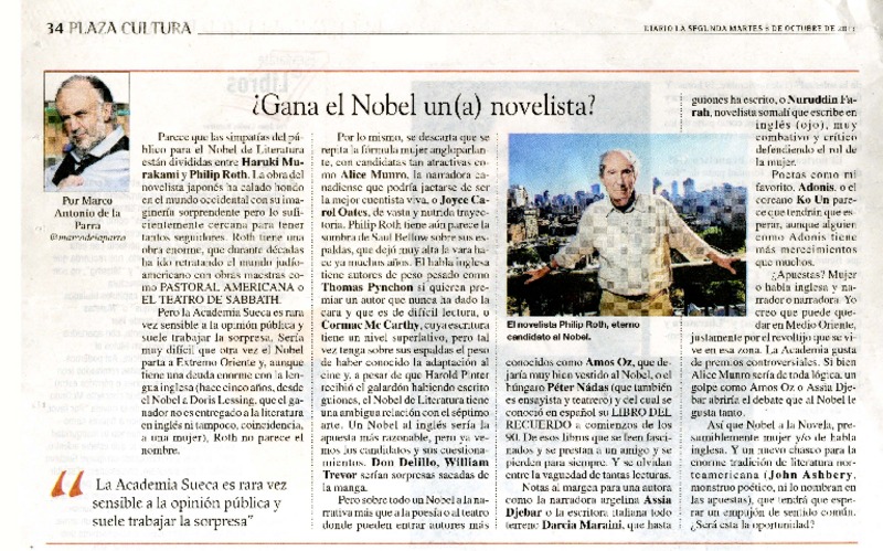 ¿Gana el Nobel un (a) novelista? [artículo] Marco Antonio de la Parra