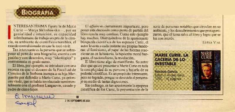 Autores chilenos - García, Horacio - Marie Curie : la cacería de lo inestable