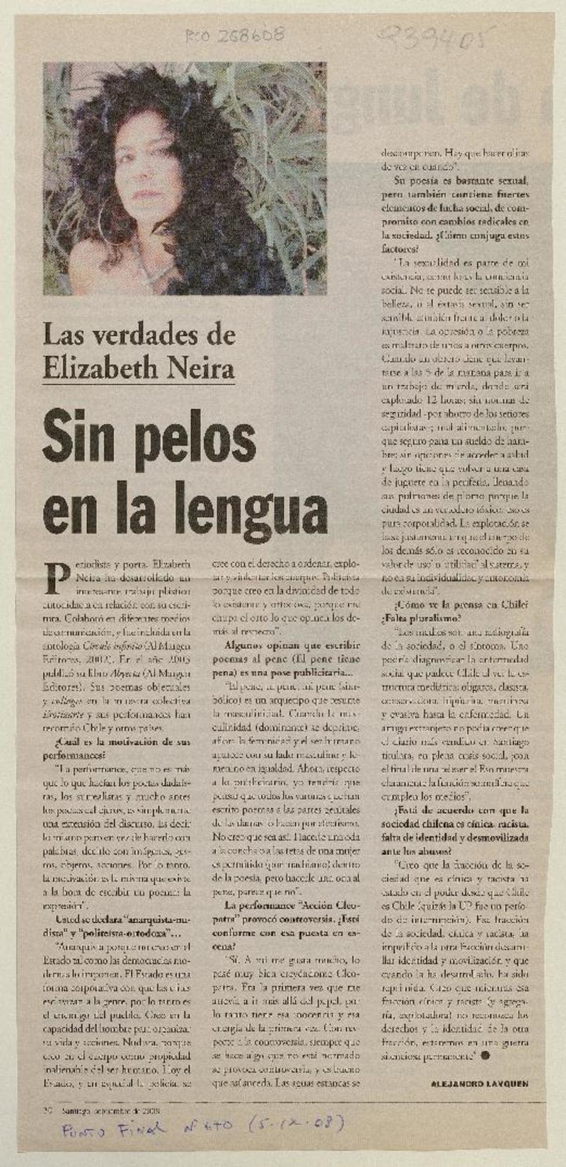 Sin pelos en la lengua (entrevista) [artículo] Alejandro Lavquen.