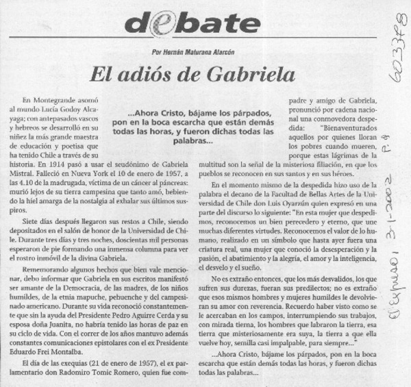 El adiós de Gabriela [artículo] Hernán Maturana Alarcón