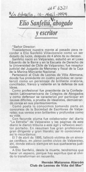 Elio Sanfeliú, abogado y escritor [artículo] Hernán Maturana Alarcón.