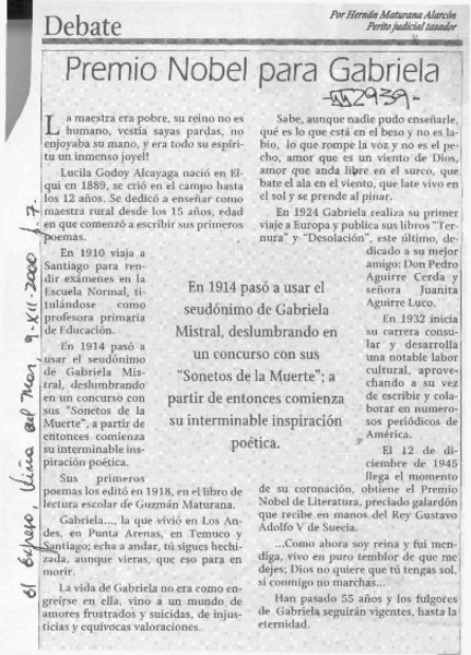 Premio Nobel para Gabriela [artículo] Hernán Maturana Alarcón