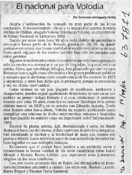 El nacional para Volodia [artículo] Fernando Arriagada Cortés