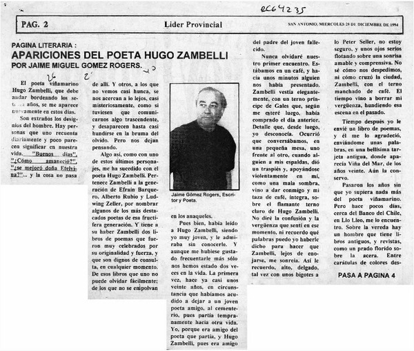 Apariciones del poeta Hugo Zambelli [artículo] Jaime Miguel Gómez Rogers.