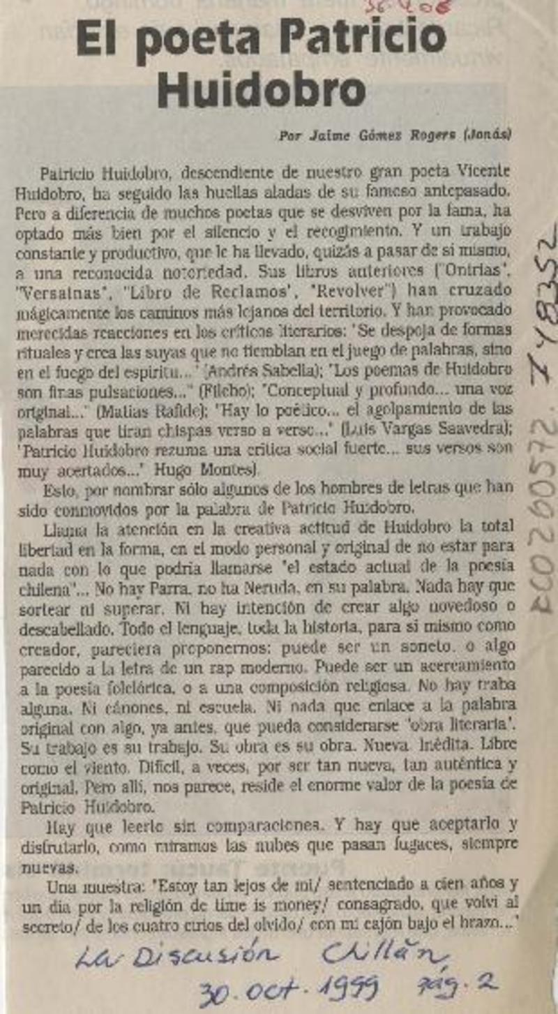 Autores chilenos - Szmulewicz, Efraín - Huidobro, Patricio - Patricio Huidobro, silencioso y silenciado