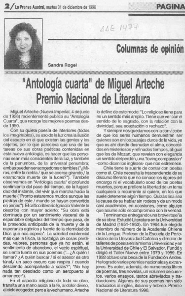 "Antología cuarta" de Miguel Arteche Premio Nacional de Literatura [artículo] Sandra Rogel.
