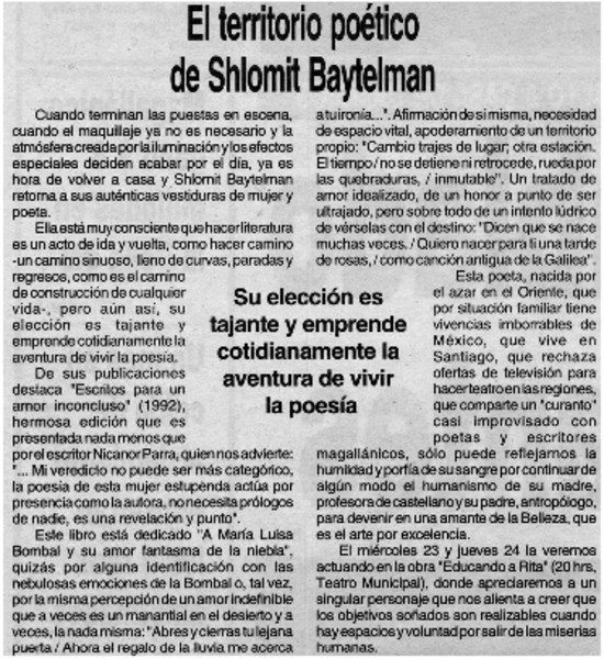 El territorio poético de Shlomit Baytelman [artículo] Sandra Rogel.