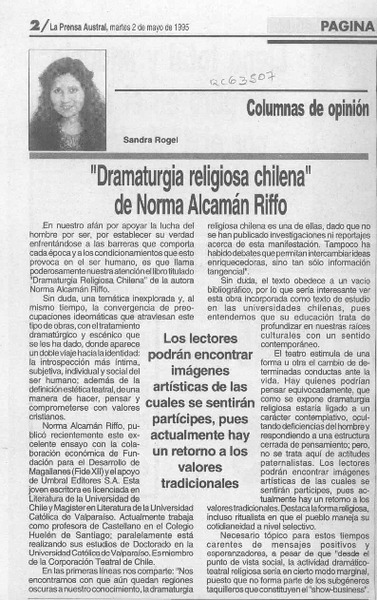 "Dramaturgia religiosa chilena" de Norma Alcamán Riffo [artículo] Sandra Rogel.