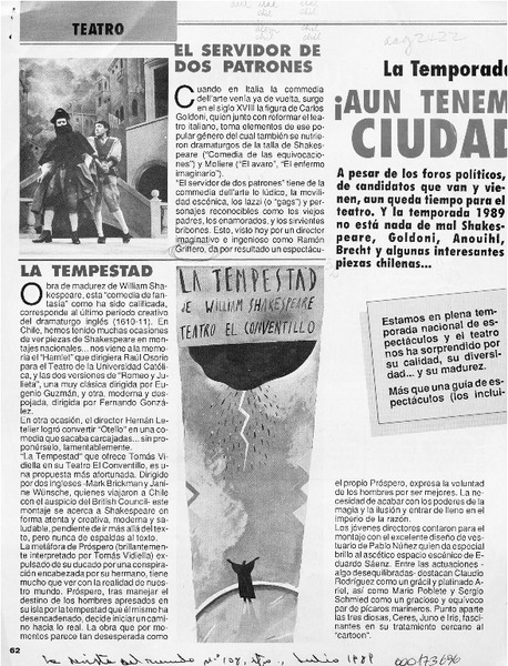 Autores chilenos - BRECHT, BERTOLT - GALILEO GALILEI - SERVIDOR DE DOS PATRONES, EL - ORQUESTA DE SEÑORITAS - ANOUILH, JEAN - Chiloé, Cielos cubiertos - INGENUAS PALOMAS - Iribarren, Juan Mateo - Pineda, José - Autores italianos - Autores franceses - Griffero S., Ramón - Autores alemanes - SIEVEKING, ALEJANDRO - Requena, María Asunción - GOLDONI, CARLO