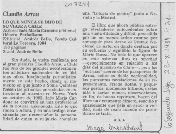 "Claudio Arrau, lo que nunca se dijo de su visita a Chile" [artículo] Jorge Marchant.