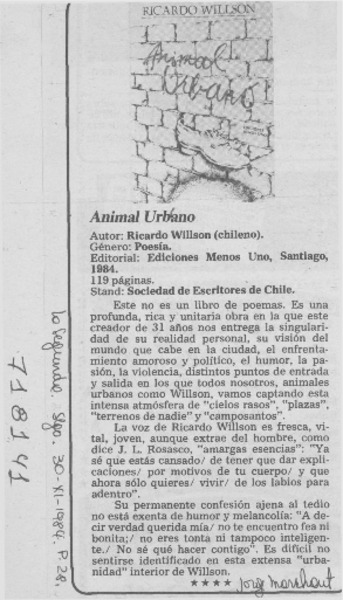 Autores chilenos - Willson, Ricardo - Animal urbano