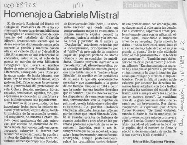 Homenaje a Gabriela Mistral [artículo] Héctor Edo. Espinoza Viveros.