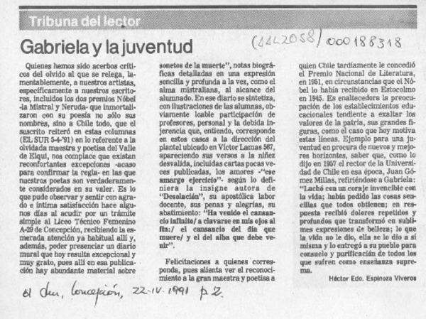 Gabriela y la juventud [artículo] Héctor Edo. Espinoza Viveros.