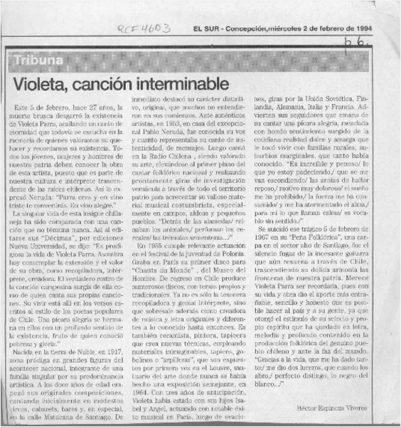 Violeta, canción interminable [artículo] Eduardo Espinoza Viveros.