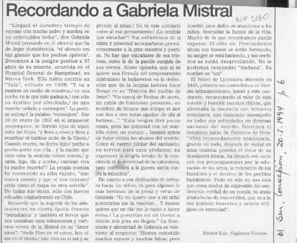 Recordando a Gabriela Mistral [artículo] Héctor Edo. Espinoza Viveros.