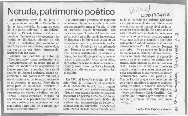 Neruda, patrimonio poético [artículo] Héctor Edo. Espinoza Viveros.