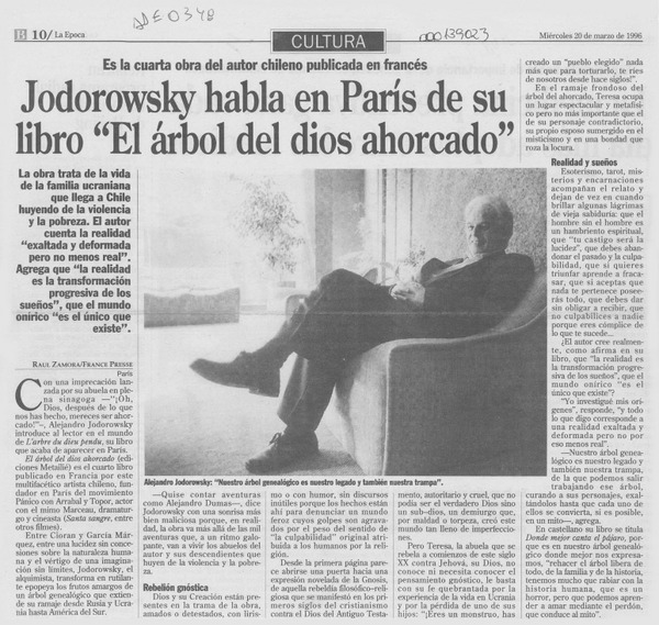 Jodorowsky habla en París de su libro "El árbol del dios ahorcado" [artículo] Raúl Zamora.
