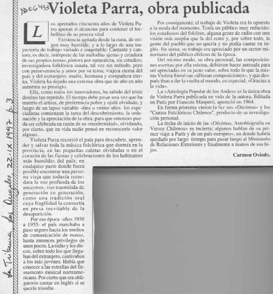 Violeta Parra, obra publicada [artículo] Carmen Oviedo.