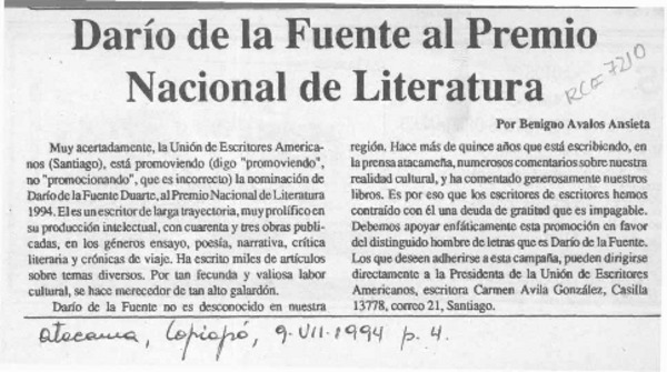 Darío de la Fuente al Premio Nacional de Literatura [artículo] Benigno Avalos Ansieta.