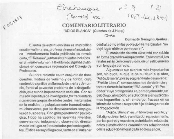 "Adiós Blanca" [artículo] Benigno Avalos.
