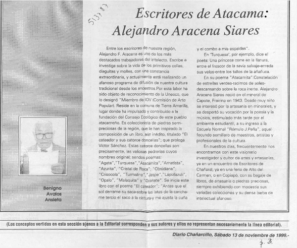 Escritores de Atacama, Alejandro Aracena Siares [artículo] Benigno Avalos Ansieta