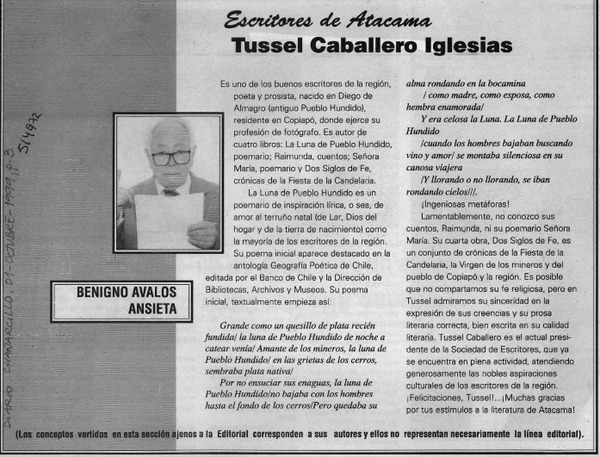 Escritores de Chanaral [artículo] Benigno Avalos Ansieta.