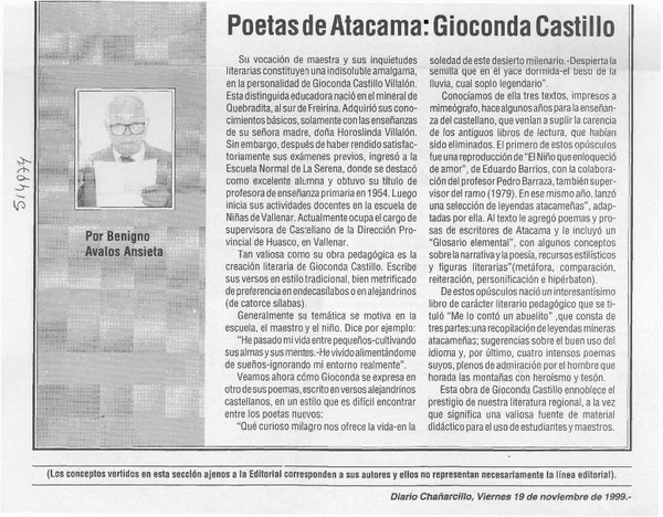 Poetas de Atacama, Gioconda Castillo [artículo] Benigno Avalos Ansieta