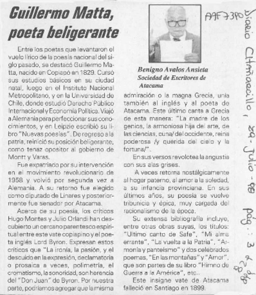 Guillermo Matta, poeta beligerante [artículo] Benigno Avalos Ansieta.