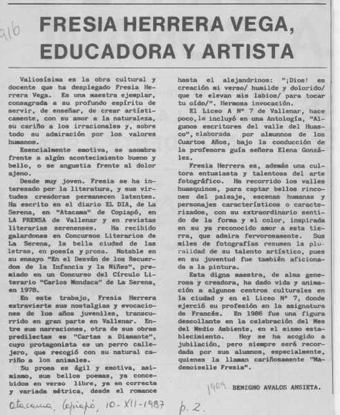 Fresia Herrera Vega, educadora y artista [artículo] Benigno Avalos Ansieta.