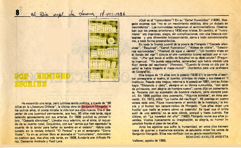 Don Benigno escribe [artículo] Benigno Avalos Ansieta.