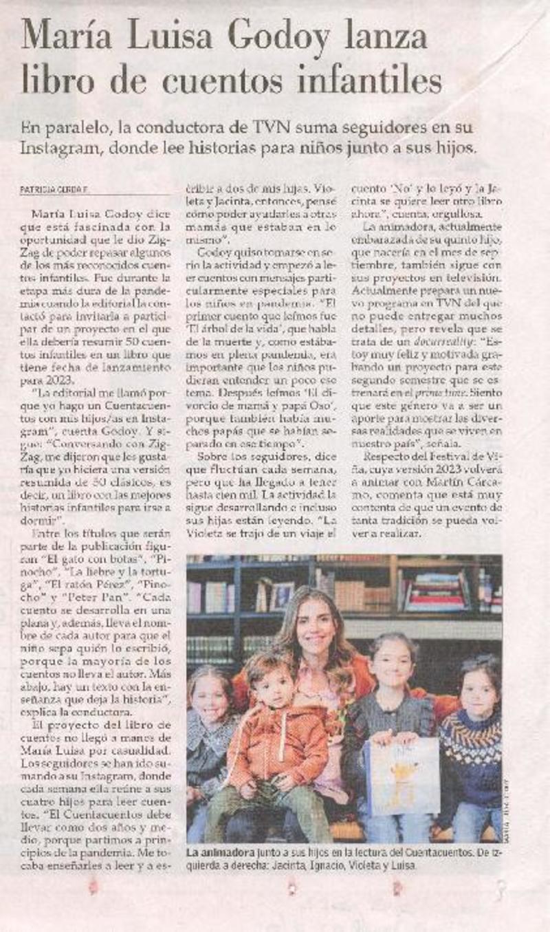 María Luisa Godoy lanza libro de cuentos infantiles [artículo] Patricia Cerda.