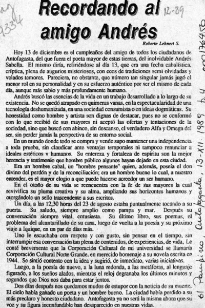 Recordando al amigo Andrés [artículo] Roberto Lehnert S.