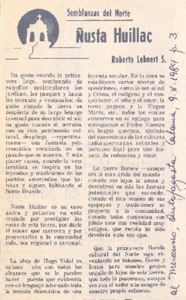 "Ñusta Huillac", obra con un saldo positivo [artículo] Roberto Lehnert Santander.