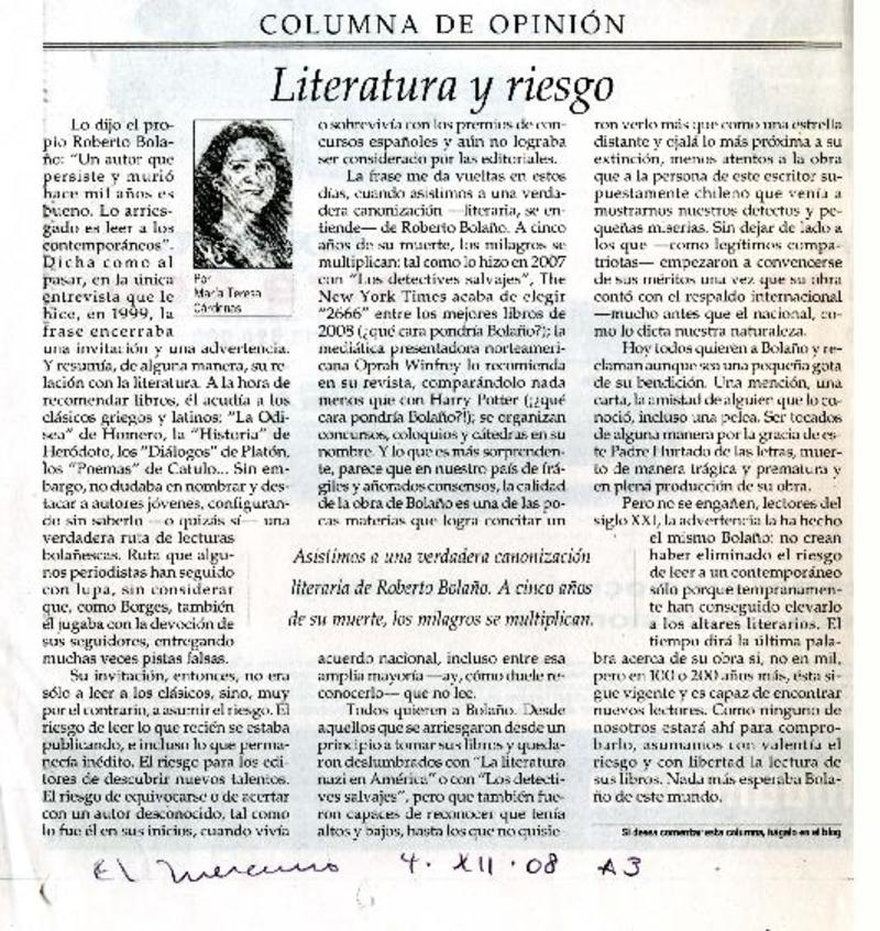 Literatura y riesgo [artículo] María Teresa Cárdenas.