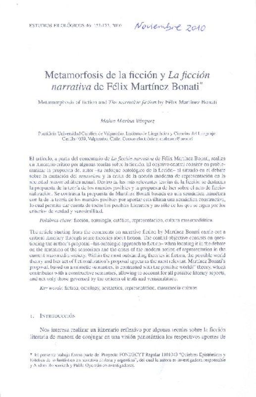 Metamorfosis de la ficción y La ficción narrativa de Félix Martínes Bonati [artículo] Malva Marina Vásquez.