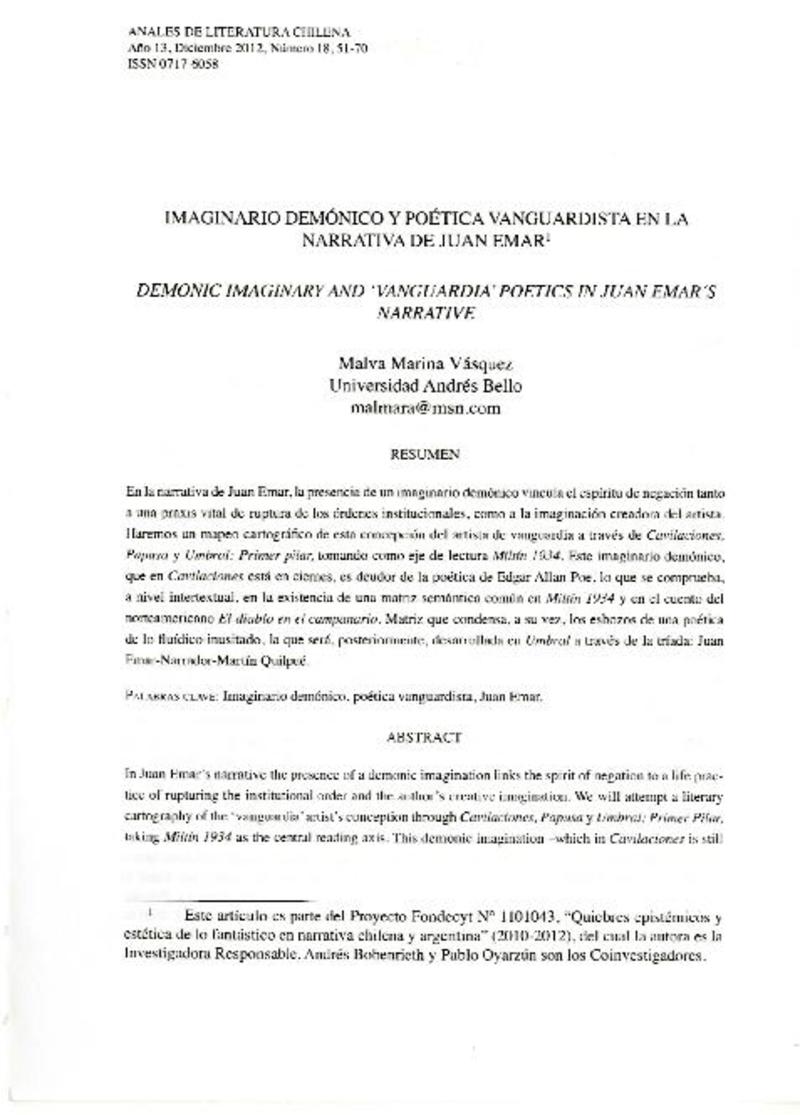 Imaginario demónico y poética vanguardista en la narrativa de Juan Emar [artículo] Malva Marina Vásquez