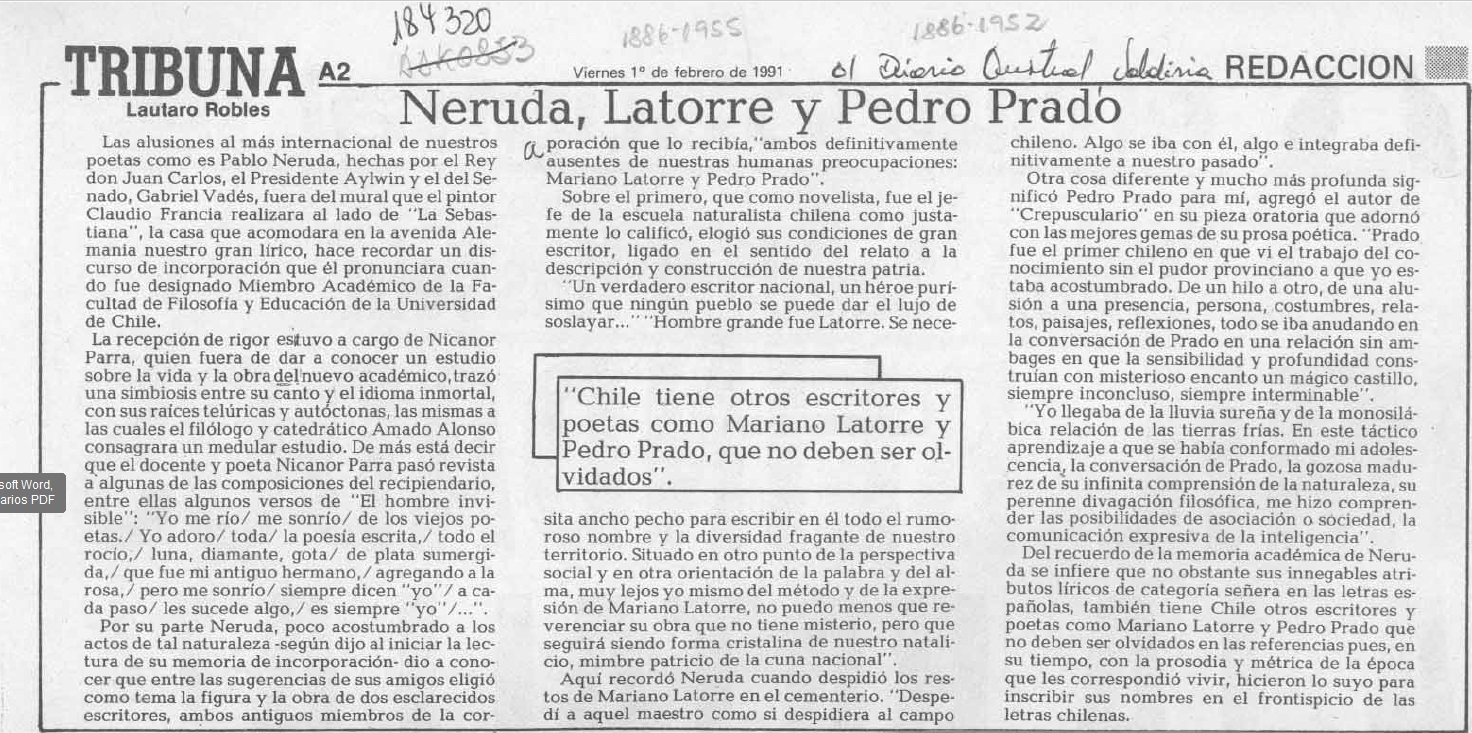 Neruda, Latorre y Pedro Prado [artículo] Lautaro Robles.